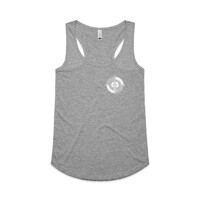 Curved hem, racer back detail, self-fabric binding at neck and armholes